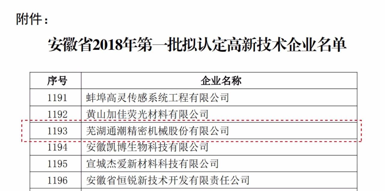 2018年7月24日,國家高新技術企業認定管理官網公示了安徽省2018年第一批認定高新技術企業名單,蕪湖通潮榜上有名。